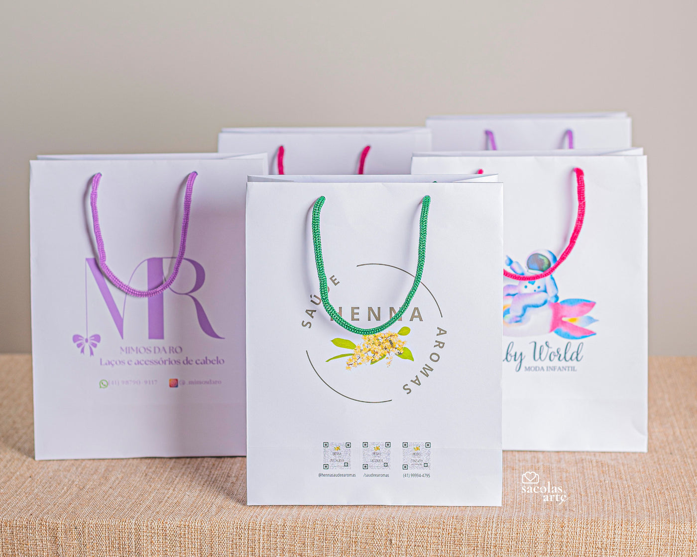 Nossa logo é aplicada de forma discreta no fundo da sacola, sem interferir no seu design.